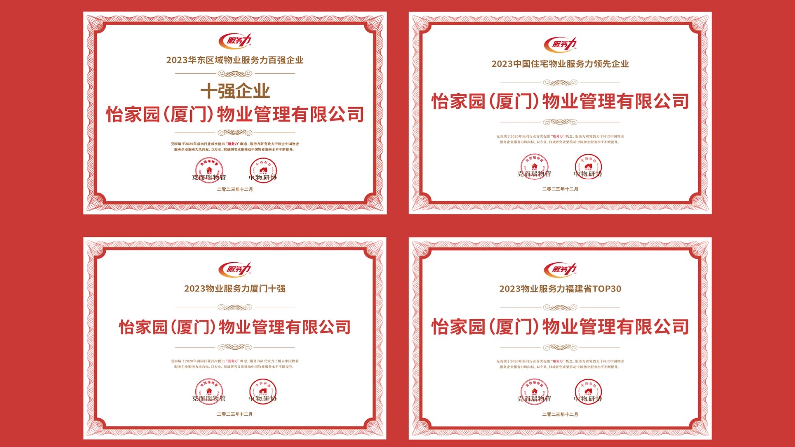 近日,在由克而瑞物管、中物研協(xié)主辦的“2023華東區(qū)域品牌戰(zhàn)略創(chuàng)新年會”上,建發(fā)物業(yè)旗下怡家園(廈門)物業(yè)管理公司獲“2023華東區(qū)域物業(yè)服務(wù)力百強(qiáng)企業(yè)第7位”“2023物業(yè)服務(wù)力福建省第1位”“2023中國住宅物業(yè)服務(wù)力領(lǐng)先企業(yè)第1位”“2023物業(yè)服務(wù)力廈門十強(qiáng)第1位”多項(xiàng)榮譽(yù)。廈門聯(lián)發(fā)(集團(tuán))物業(yè)服務(wù)公司則位列“2023物業(yè)服務(wù)力廈門十強(qiáng)”第2位。