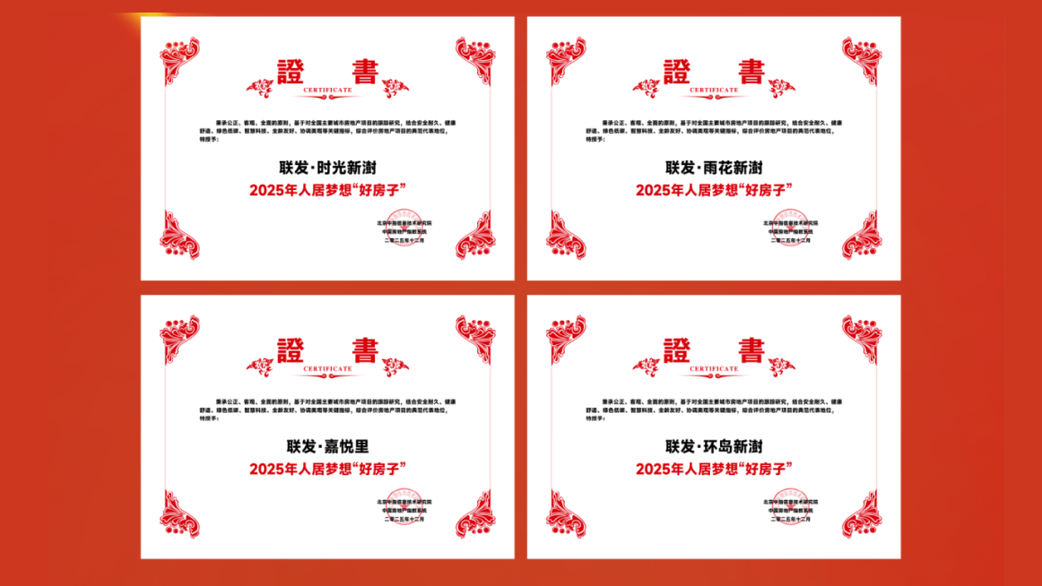 12月11日,由北京中指信息技術(shù)研究院主辦、中國房地產(chǎn)指數(shù)系統(tǒng)中國物業(yè)服務(wù)指數(shù)系統(tǒng)承辦的“2025中國房地產(chǎn)大數(shù)據(jù)年會(huì)暨2026中國房地產(chǎn)市場趨勢(shì)報(bào)告會(huì)”在北京召開。聯(lián)發(fā)集團(tuán)在2025年中國房地產(chǎn)產(chǎn)品力測(cè)評(píng)中再獲行業(yè)認(rèn)可:獲評(píng)“中國房地產(chǎn)產(chǎn)品力優(yōu)秀企業(yè)”稱號(hào);集團(tuán)旗下四大標(biāo)桿項(xiàng)目“上海·時(shí)光新澍”“南京·雨花新澍”“廈門·嘉悅里”“廈門·環(huán)島新澍”,憑借產(chǎn)品設(shè)計(jì)、精工品質(zhì)與對(duì)當(dāng)代居住需求的深度回應(yīng),齊齊上榜2025年人居夢(mèng)想“好房子”名單。
